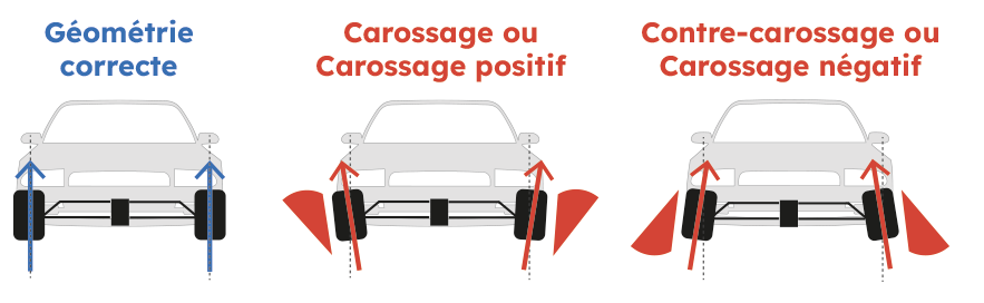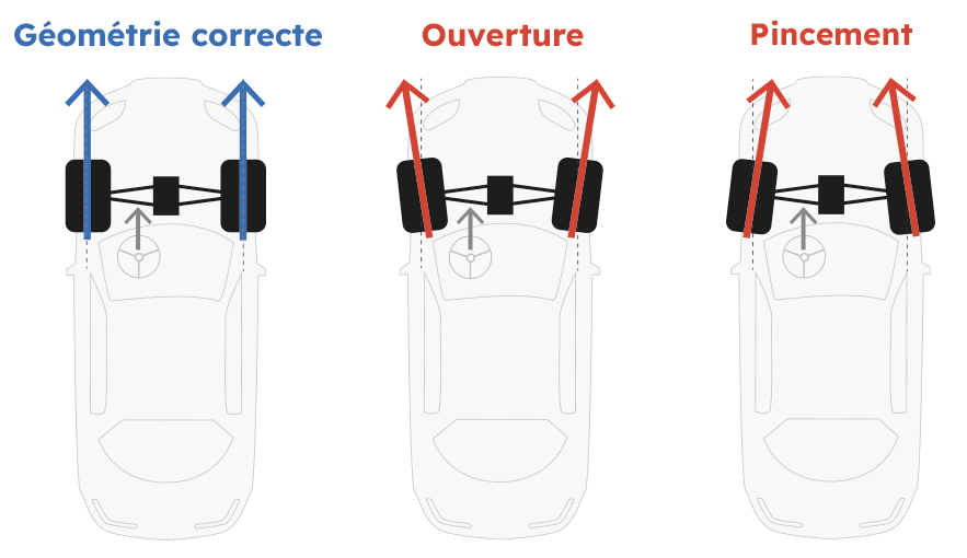 Le parallélisme règle l’angle des roues avant/arrière, la géométrie inclut l’ensemble des angles (carrossage, chasse).