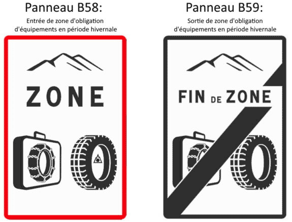 Les zones pneus neige obligatoires sont définies par arrêté préfectoral et signalées par les panneaux B58 et B59.