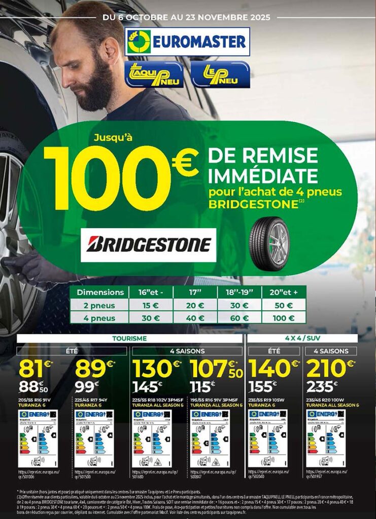 Offre réservée aux clients particuliers, valable du 6 octobre au 23 novembre 2025 inclus, pour l’achat et le montage simultanés, dans l’un des centres Euromaster TAQUIPNEU, LE PNEU, participants en France métropolitaine, de 2 ou 4 pneus BRIDGESTONE tourisme, 4×4, camionnette de catégorie Été, Hiver, Toutes Saisons.