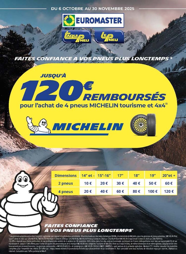 Jusqu’à 120€ offerts pour l’achat de quatre (4) pneumatiques de la marque MICHELIN des catégories Tourisme et 4×4 (Été, Hiver ou CrossClimate), de même dimension et de même gamme, sous forme de remboursement par virement bancaire.