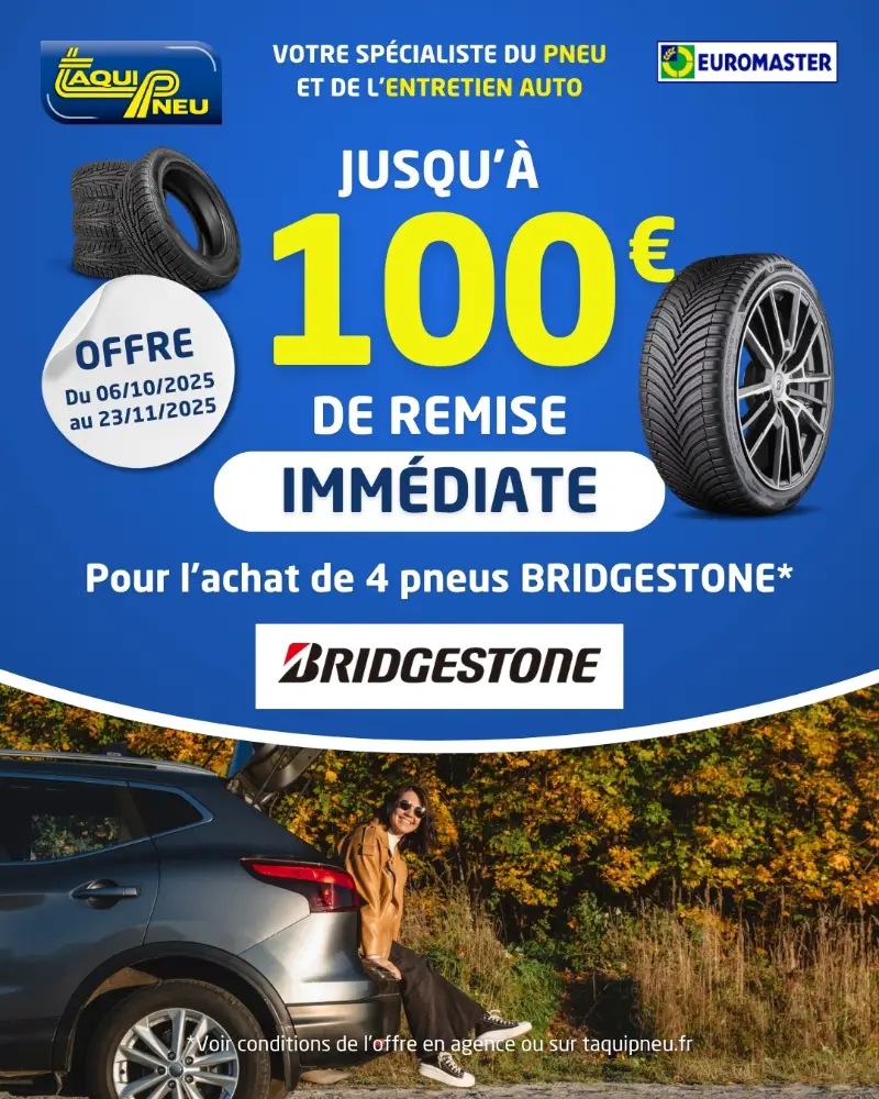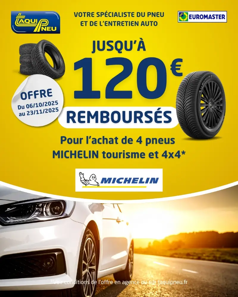 Profitez de promos pneus toutes marques – Michelin, Continental, Bridgestone, Goodyear, Kleber, et bien d’autres – montés par nos techniciens certifiés Euromaster. Que ce soit pour des pneus été, hiver ou 4 saisons, nos centres auto Taquipneu vous garantissent des pneus pas chers à Toulouse, Bordeaux et dans tout le Sud-Ouest.