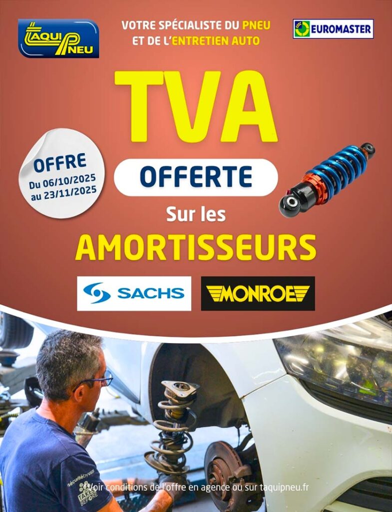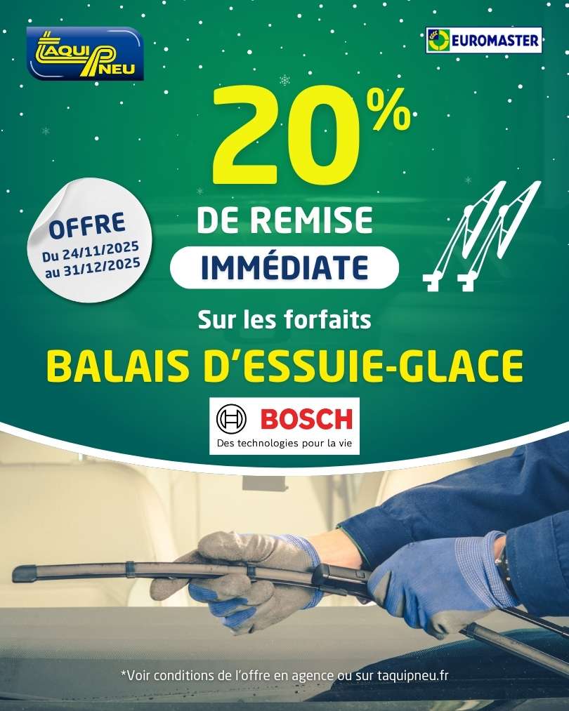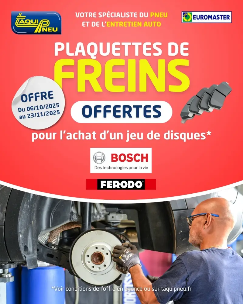 Nos promos Taquipneu Euromaster ne s’arrêtent pas là : découvrez également des réductions sur vos révisions constructeur, vidanges, freins, amortisseurs, batteries, essuie-glaces et diagnostics sécurité ou électrique. Chaque intervention est réalisée avec le même niveau d’exigence et de professionnalisme, dans des ateliers modernes et équipés pour votre tranquillité d’esprit.
