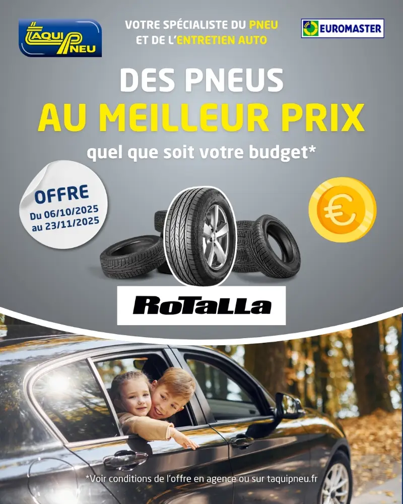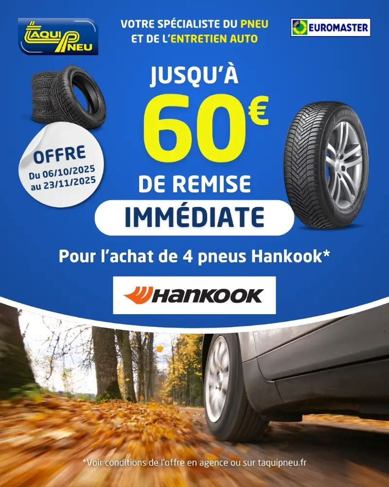 Chez Taquipneu, nous savons qu’entretenir son véhicule peut vite peser sur le budget. C’est pourquoi nous proposons toute l’année des promos sur les pneus et de nombreuses offres sur l’entretien de la voiture, pour vous permettre de rouler en toute sécurité sans sacrifier votre portefeuille.