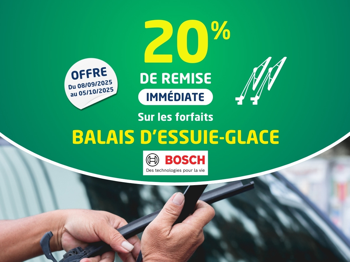 Offre réservée aux clients particuliers, valable du 8 septembre au 5 octobre 2025 inclus, uniquement dans l’un des centres Taquipneu Euromaster. SOIT une remise immédiate de 20% sur l’achat d’un forfait comprenant la pose et la fourniture de 1 ou 2 balais d’essuie-glaces de marque BOSCH .
