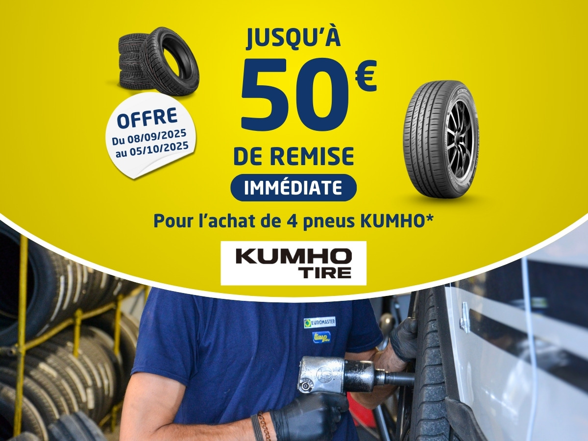 Offre valable pour tout achat, de deux (2) ou quatre (4) pneumatiques KUMHO de catégories Tourisme, 4x4, Camionnette (Eté, Hiver ou Toutes Saisons) de même dimension et de même gamme, effectué du 8 septembre au 5 octobre 2025, sur euromaster.fr.