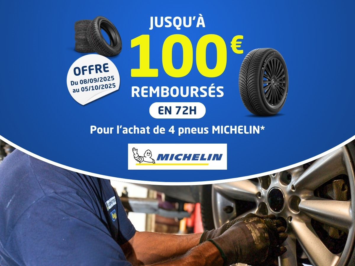 Offre valable pour l’achat et le montage simultanés de deux (2) ou quatre (4) pneus MICHELIN de catégorie tourisme & 4x4 (Été, Hiver ou CrossClimate) de même dimension et de même gamme, effectué entre le 8 septembre et le 5 octobre 2025 inclus, dans l’un des centres Taquipneu Euromaster. Les gammes camionnette « MICHELIN AGILIS » et camping-car « MICHELIN CROSSCLIMATE CAMPING » sont exclues de la présente opération.