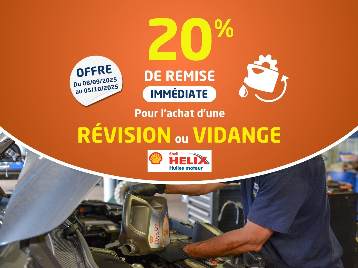 Offre réservée aux clients particuliers, valable du 8 septembre au 5 octobre 2025 inclus dans l’un des centres Taquipneu Euromaster ou euromasteer.fr. SOIT une remise immédiate de 20% pour l’achat d’un forfait vidange filtre à huile et de tout achat en sus d’un forfait filtre (filtre à air, habitacle, et/ou carburant) ou d’une révision constructeur** avec garantie constructeur préservée avec les produits BOSCH et SHELL ou de marques équivalentes. Hors forfaits véhicules électriques.